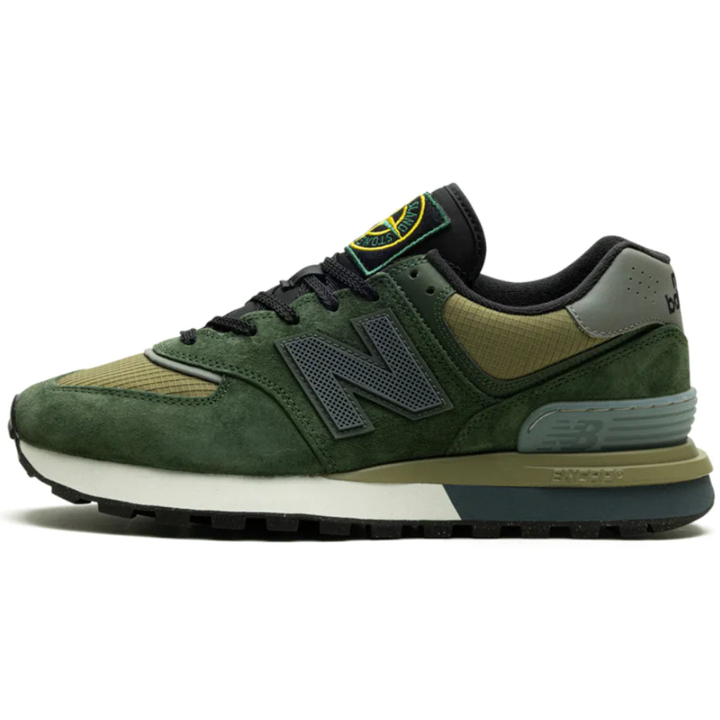 O New Balance 574 Legacy x Stone Island "Dark Green" é uma colaboração entre a New Balance e a marca italiana Stone Island. Este modelo combina o design clássico da silhueta 574 com elementos inspirados nas peças de arquivo da Stone Island dos anos 1980, resultando em um tênis que une estilo e funcionalidade. Confeccionado em tecido ripstop bege, inspirado em uma jaqueta da coleção de outono de 1988 da Stone Island, com sobreposições de nobuck verde escuro. Este modelo destaca-se pela fusão da estética inovadora da Stone Island com a funcionalidade clássica da New Balance, resultando em um tênis que equilibra estilo e desempenho.